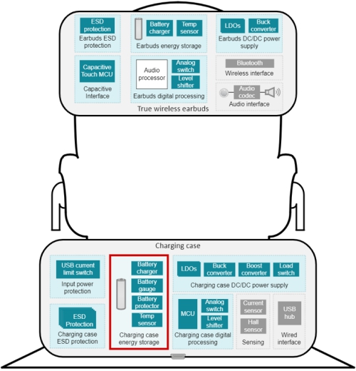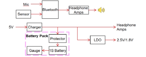 電池一般都是單節(jié)鋰電池,一般是由電池包廠商提供,并且已經(jīng)將電量計(jì)和二次保護(hù)IC封包在內(nèi),保證電池更可靠的工作。單節(jié)鋰電池的電源主要供給兩部分:一部分升壓到5V給耳機(jī)供電,另一部分降壓到3V及以下給盒子內(nèi)的MCU/Sensor等。