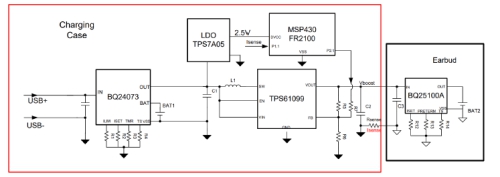 TI有一份針對(duì)TWS耳機(jī)的參考設(shè)計(jì)TIDA-050007,下圖是參考設(shè)計(jì)的系統(tǒng)框圖。這個(gè)參考設(shè)計(jì)整機(jī)功耗只有18uA,并且采用簡(jiǎn)易算法實(shí)現(xiàn)升壓的動(dòng)態(tài)調(diào)節(jié),在充電盒電池電壓高于耳機(jī)電池電壓時(shí)升壓芯片TPS61099還可以進(jìn)入直通模式,使充電效率進(jìn)一步提高。