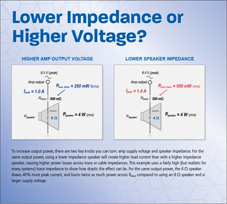 隨著設備尺寸變得越來越小,電源也隨之變小。鋰電池因其使用壽命長和充電時間短而備受歡迎。例如通過USB連接的5伏電源也是一種流行的標準。但是這些電源能提供響亮的音頻效率嗎?在大多數(shù)情況下,答案是否定的。例如,使用標準的3.7 V鋰離子作為電源,驅(qū)動典型8Ω揚聲器的高效放大器則提供不到1瓦的電能。當電池電量不足或電池老化時,電池電壓會降低,而電池阻抗則會增加2-3倍。如圖1所示,這將導致傳遞到揚聲器的輸出功率更少。為什么不只使用低阻抗揚聲器呢?因為這將不僅增加輸出功率,還會在放大器和揚聲器之間的走線或電纜上造成更高的負載電流和更大的功率損耗。(參見圖2)。