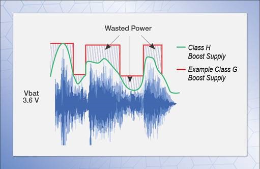 并非所有的升壓放大器都一樣。架構(gòu)已發(fā)展演變?yōu)樵黾与妷骸⑤敵龉β屎托。G類配置提供兩個或三個不同的升壓輸出電壓電平。升壓轉(zhuǎn)換器會根據(jù)音頻內(nèi)容自動選擇所需的最小輸出電壓電平,以將轉(zhuǎn)換損耗降至最低。H類功放擁有更多級數(shù)的升壓電平,能夠細致地追隨包絡輸入音頻信號, 實現(xiàn)更高的效率(有關G類和H類升壓放大器的比較,請參見圖3)。即使在H類中,也并非所有升壓設計都是一樣的。重要的是要考慮升壓電壓跟蹤音頻包絡的速度和接近程度。例如,Cirrus Logic的CS35L41音頻放大器具有非?焖俑櫟11V H類升壓轉(zhuǎn)換器。它也是首批采用55nm工藝的升壓放大器之一,與130nm或180nm等較大的模擬放大器工藝相比,它可以將很多工藝封裝在一個較小的區(qū)域內(nèi),實現(xiàn)更緊密、更快的升壓轉(zhuǎn)換器控制環(huán)路。
