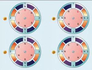 最后,我們?cè)僖淮吻袛嗬@組2中的電流,并給繞組1輸送如圖2a所示的電流,這樣,轉(zhuǎn)子又會(huì)回到原來(lái)的位置。