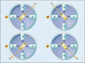 現(xiàn)在假設(shè)我們構(gòu)造一個(gè)定子上纏繞有兩個(gè)繞組的電機(jī),內(nèi)置一個(gè)能夠繞中心任意轉(zhuǎn)動(dòng)的永久磁鐵,這個(gè)可旋轉(zhuǎn)部分叫做轉(zhuǎn)子。圖2給出了一種簡(jiǎn)單的電機(jī),叫做雙相雙極電機(jī),因?yàn)槠涠ㄗ由嫌袃蓚(gè)繞組,而且其轉(zhuǎn)子有兩個(gè)磁極。如果我們按圖2a所示方向給繞組1輸送電流,而繞組2中沒有電流流過(guò),那么電機(jī)轉(zhuǎn)子的南極就會(huì)自然地按圖中所示,指向定子磁場(chǎng)的北極。