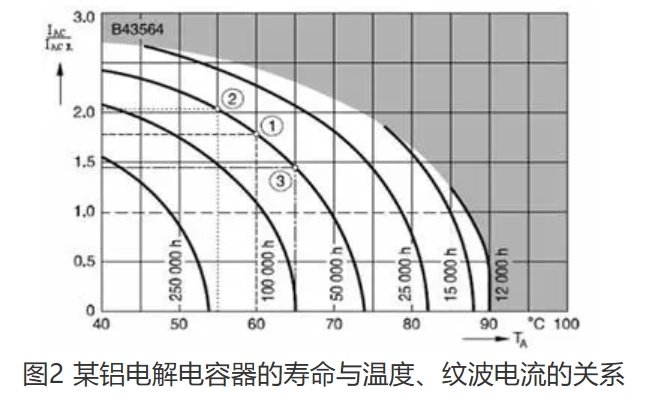 另一方面,電解電容器的壽命還與電容器長(zhǎng)時(shí)間工作的交流電流與額定脈沖電流(一般是指在85℃的環(huán)境溫度下測(cè)試值,但是有一些耐高溫的電解電容器是在125℃時(shí)測(cè)試的數(shù)據(jù))的比值有關(guān)。一般說(shuō)來(lái),這個(gè)比值越大,電解電容器的壽命越短,當(dāng)流過(guò)電解電容器的電流為額定電流的3.8倍時(shí),電解電容器一般都已經(jīng)損壞。所以,電解電容器有它的安全工作區(qū),對(duì)于一般應(yīng)用,當(dāng)交流電流與額定脈沖電流的比值在3.0倍以下時(shí),對(duì)于壽命的要求已經(jīng)滿足。環(huán)境溫度和紋波電流對(duì)電解電容器的影響如圖2所示。