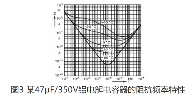 在開關(guān)電源輸出端用的濾波電容,與工頻電路中選用的濾波電容并不一樣,在工頻電路中用作濾波的普通電解電容器,其上的脈動(dòng)電壓頻率僅有100Hz,充放電時(shí)間是毫秒數(shù)量級(jí),為獲得較小的脈動(dòng)系數(shù),需要的電容量高達(dá)數(shù)十萬(wàn)微法,因而一般低頻用普通鋁電解電容器制造目標(biāo)是以提高電容量為主,電容器的電容量、損耗角正切值以及漏電流是鑒別其優(yōu)劣的主要參數(shù)。在開關(guān)穩(wěn)壓電源中作為輸出濾波用的電解電容器,由于大多數(shù)的開關(guān)電源工作在方波或矩形波的狀態(tài),含有及其豐富的高次諧波電壓與電流,其上鋸齒波電壓的頻率高達(dá)數(shù)十千赫,甚至數(shù)十兆赫,它的要求和低頻應(yīng)用時(shí)不同,電容量并不是主要指標(biāo),衡量它好壞的則是它的阻抗頻率特性,如圖3所示。