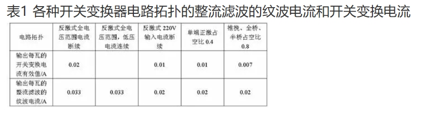 影響電解電容器性能的最主要的參數(shù)之一就是紋波電流問(wèn)題。紋波電流對(duì)鋁電解電容器的影響主要是在ESR上產(chǎn)生功耗使鋁電解電容器發(fā)熱,進(jìn)而縮短使用壽命。 從特性曲線中(圖2)可以看到,紋波電流在ESR上產(chǎn)生的損耗與紋波電流有效值的平方成正比,因而隨著紋波電流的增加,小時(shí)壽命曲線類似于拋物線函數(shù)曲線。降低紋波電流的方法可以采用較大容量的鋁電解電容器,畢竟大容量鋁電解電容器可承受的紋波電流比小容量的鋁電解電容器大;也可以采用多只小容量鋁電解電容器的并聯(lián)方式,還可以選用紋波電流低的電路拓?fù)浣Y(jié)構(gòu)。一般而言,反激式變換器產(chǎn)生的開關(guān)變換電流相對(duì)最大。表1是各種開關(guān)變換器電路拓?fù)涞闹绷麟娏、整流濾波的紋波電流、開關(guān)變換電流和濾波電容上的總紋波電流。