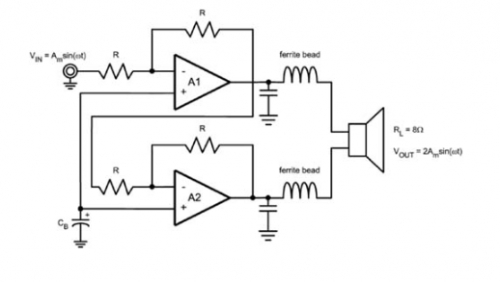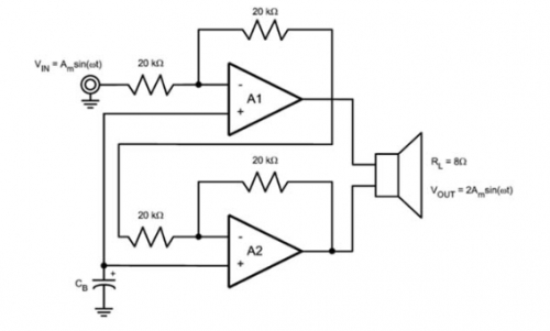 在該結(jié)構(gòu)(圖 1)中,一個(gè)輸入信號(hào) VIN 加到放大器 A1 的反相輸入端并通過(guò)增益為 0dB 的放大。A1 的輸出連接到揚(yáng)聲器的一側(cè)和放大器 A2 的反相輸入端,同樣經(jīng)過(guò) 0dB 增益放大。A2 的輸出連接到揚(yáng)聲器的另一端。因?yàn)?A2 的輸出同 A1 的輸出是 180 度反相的,A1 和 A2 之間的最終差值 VOUT,是單個(gè)放大器輸出幅值的兩倍。當(dāng)給定正弦輸入信號(hào), 比較單端放大器,該 BTL 結(jié)構(gòu)有效地加倍輸出電壓,使得在相同負(fù)載下輸出功率增加為原來(lái)的四倍(圖 2)。