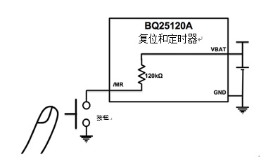BQ25120A系列產(chǎn)品充電器的運(yùn)輸節(jié)電模式使用按鈕接口實(shí)現(xiàn),如圖2所示。按鈕輸入(/MR)在內(nèi)部上拉至VBAT管腳。當(dāng)器件處于運(yùn)輸節(jié)電模式且用戶(hù)按下/MR按鈕時(shí),產(chǎn)品將退出運(yùn)輸節(jié)電模式。