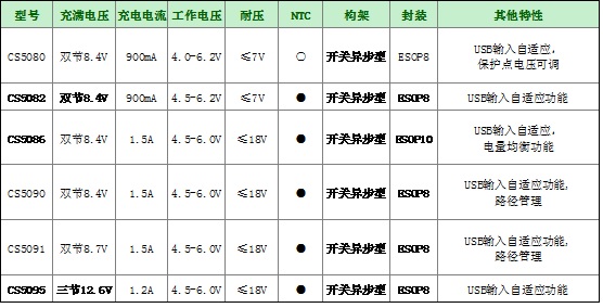 USB_5V輸入用于兩節(jié)鋰電池串聯(lián)8.4V充電管理芯片:CS5080,CS5082,CS5086,CS5090;用于三節(jié)鋰電池串聯(lián)12.6V充電管理芯片:CS5095。每個型號全部具備輸入自適應(yīng)功能,任何大小電流的USB接口都可以正常充電,最大充電電流1.5A。另外,都具備完整的涓流,恒流,恒壓充電過程,各種安全可靠的保護措施以及充電狀態(tài)指示,大部分型號還帶了NTC溫度控制功能。CS5086還具備電量均衡功能,對電池的循環(huán)充電次數(shù)以及穩(wěn)定性大有提升。升壓型充電管理芯片適合應(yīng)用于藍(lán)牙音響、榨汁機、POS機、手持打印機、無人機、筋膜槍電動工具等產(chǎn)品領(lǐng)域,未來具備廣泛的市場前景。