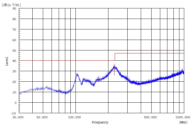 HT360使用Demo板12V供電、輸出接2個4ohm喇叭,喇叭線長度約10cm, 輸出接了330R@100MHz磁珠和下地的1nF電容,使用1kHz信號輸出2*15W時,測得的輻射曲線如下圖(取輻射嚴重的方向)。