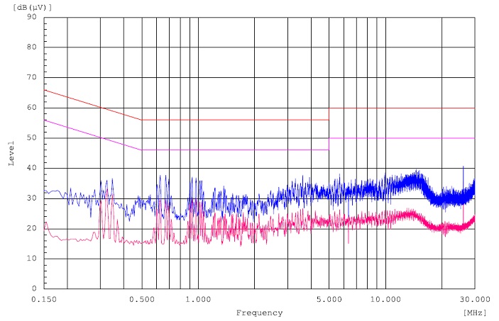 另外,HT360具有擴頻功能,可輕松通過傳導認證。使用Demo 板,12V 適配器供電、輸出接2個4ohm喇叭,喇叭線長度約10cm, 輸出接了330R@100MHz 磁珠和下地的1nF電容,使用1kHz信號輸出2*15W時,測得的傳導曲線如下圖(取輻射嚴重的方向)。