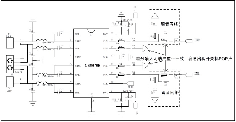 大部分D類功放都是差分輸入,如果差分輸入兩端參數(shù)不一致,功放上電,掉電時兩邊充放電時間不一樣。兩邊相減后就會現(xiàn)額外的電信號,這個電信號再經(jīng)功放放大到喇叭端就會出現(xiàn)POP聲。所以盡量保持差分兩端網(wǎng)絡(luò)以及參數(shù)一致。如果主控解碼輸出是單端信號,又有復(fù)雜的調(diào)音網(wǎng)絡(luò),建議用運放隔離可以克服這個問題。