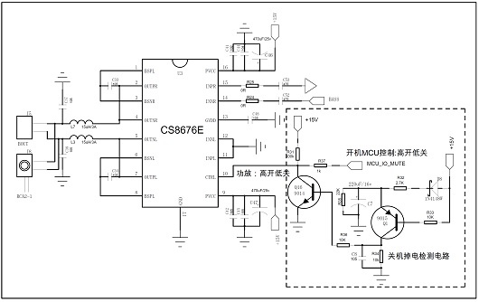 由于主控解碼芯片音頻模擬輸出的偏置電壓一般在輸出使能后建立,此時需要保持音頻功放CTRL管腳拉低(高開低關(guān)),等待主控芯片模擬輸出的偏置電壓穩(wěn)定后才可以將CTRL管腳 置高開啟功放。相反,關(guān)機時,需要關(guān)閉主芯片音頻模擬輸出功能時,需要先拉低CTRL管腳將功放關(guān)閉后,再關(guān)閉主控芯片的模擬輸出信號。這樣的時序是為了保證主芯片模擬輸出的偏置電壓掉電時不會引起POP 聲。通過主控軟件調(diào)整時序解決開關(guān)機POP聲對軟開關(guān)機音箱非常適用,對硬開關(guān)機的音箱開機也很好處理,但關(guān)機由于主控不受控,需要外圍加掉電檢測電路來解決。
