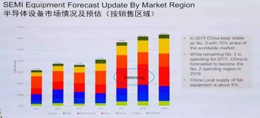 據(jù)相關(guān)數(shù)據(jù)顯示,中國大陸本土廠商的半導體設(shè)備,只占全球市場份額的1~2%。而從下圖,我們可以看到,中國大陸市場對半導體設(shè)備的需求量巨大,而且還在快速增長當中。