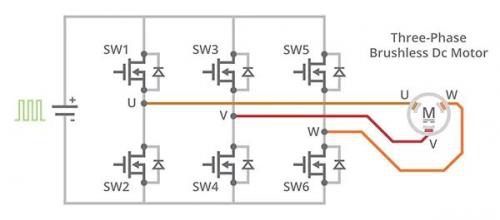 電機(jī)定子中嵌入了檢測(cè)轉(zhuǎn)子位置的霍爾效應(yīng)傳感器,這樣就可以切換三相電橋中的晶體管來(lái)驅(qū)動(dòng)電機(jī)。三個(gè)霍爾效應(yīng)傳感器輸出一般標(biāo)記為 U、V 和 W 通道。雖然霍爾效應(yīng)傳感器能夠有效解決 BLDC 電機(jī)換向問(wèn)題,但它們僅僅滿(mǎn)足了 BLDC 系統(tǒng)一半所需。