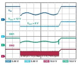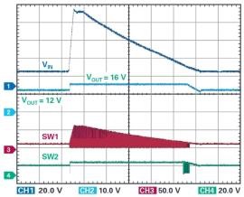 圖 2 顯示了此電路的輸入 / 輸出傳輸特性。當輸入電壓高于直通窗口時,LT8210 將其降低到穩(wěn)定的 16 V 輸出。如果輸入電壓低于直通窗口,LT8210 會增大該電壓,并將輸出保持在 8 V。當輸入電壓在直通窗口范圍內時,頂部開關 A 和 D 保持開啟,使得輸出可以跟蹤輸入,且部件可以進入低功率狀態(tài),VIN 和 VINP 引腳上的典型靜態(tài)電流分別為 4 µA 和 18 µA。在這種非開關狀態(tài)下,既不存在 EMI,也不存在開關損耗,因此效率可以達到 99.9%以上。