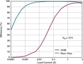 圖 5. 直通區(qū)域的效率達到將近 100%(與持續(xù)導通模式下的效率相比)。