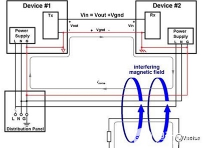 如上圖,設(shè)備一和設(shè)備2都有自己的獨(dú)立供電系統(tǒng),本來Device1和Device之間只有屏蔽線互相接GND,但是因?yàn)槎冀拥搅?20V電源,所有又構(gòu)成了如上圖紅色的地環(huán)路。