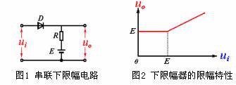 圖1所示的限幅電路中,因二極管是串在輸入、輸出之間,故稱它為串聯(lián)限幅電路。圖中,若二極管具有理想的開關(guān)特性,那么,當(dāng)ui低于E時(shí),D不導(dǎo)通,uO=E;當(dāng)ui高于E以后,D導(dǎo)通,uO=ui。該限幅器的限幅特性如圖2所示,當(dāng)輸入振幅大于E的正弦波時(shí),輸出電壓波形見圖3?梢,該電路將輸出信號(hào)的下限電平限定在某一固定值E上,所以稱這種限幅器為下限幅器。如將圖中二極管極性對(duì)調(diào),則得到將輸出信號(hào)上限電平限定在某一數(shù)值上的上限幅器。