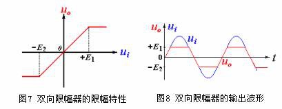 將上、下限幅器組合在一起,就組成了如圖6所示的雙向限幅電路,它的限幅特性如圖7所示。當(dāng)輸入一個(gè)振幅較大的正弦信號(hào)時(shí),輸出波形見圖8。