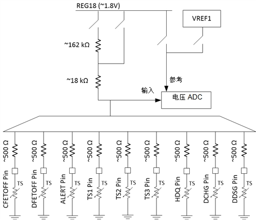 電壓ADC以REG18電壓為基準(zhǔn),按比例測量熱敏電阻引腳電壓。每個(gè)熱敏電阻上的電壓每隔一到三個(gè)測量循環(huán)測量一次。原始ADC計(jì)數(shù)值可通過DASTATUS6()子命令獲得。在正常模式下,器件每隔250ms將這些測量值轉(zhuǎn)換為溫度;在睡眠模式下,器件每隔一次測量將這些測量值轉(zhuǎn)換為溫度。