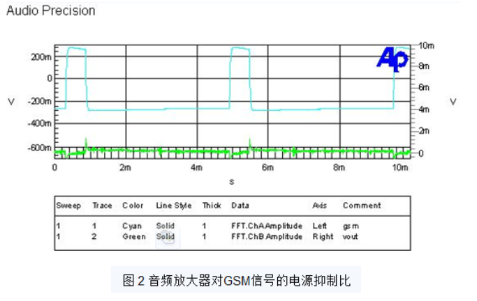 在 TDMA 和 GSM 手機(jī)中,最嚴(yán)重的電源電壓噪聲來自 RF 級的開與關(guān)。GSM 電話的開關(guān)頻率為 217Hz。當(dāng) RF 功率放大器接通時,從電源獲得高電流,這時電源下降高達(dá) 500mV。PSRR 差的音頻放大器將在揚(yáng)聲器產(chǎn)生大于 217Hz 的諧波“咔咔”噪聲。圖 2為PSRR為60dB的放大器對GSM信號的抑制能力。