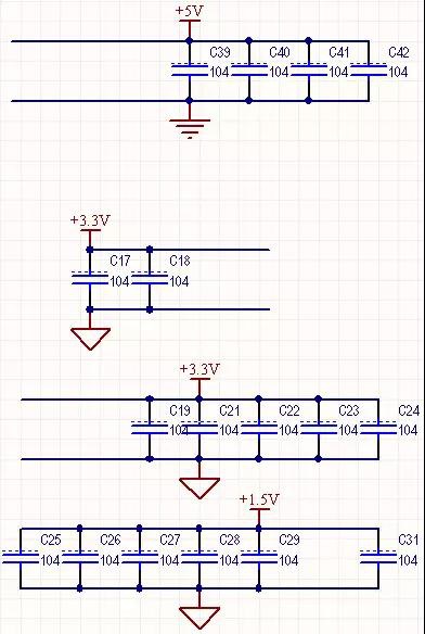 值得注意的是:在布線的時(shí)候,經(jīng)退藕電容退藕后的電源輸出點(diǎn)應(yīng)該盡量緊靠芯片的電源引腳進(jìn)行供電,過長的引線有可能重新變成干擾接收天線,導(dǎo)致退藕效果消失。如果無法讓每個(gè)退藕后的電源輸出點(diǎn)均緊靠芯片的電源引腳,那么可以采用分別退藕的方法,即分別盡量緊靠每個(gè)芯片的電源引腳點(diǎn)接入退藕電容進(jìn)行退藕,這也解釋了為什么圖1-1的3.3V電源有兩個(gè)退藕輸出點(diǎn)。
