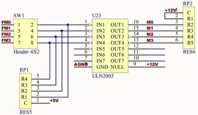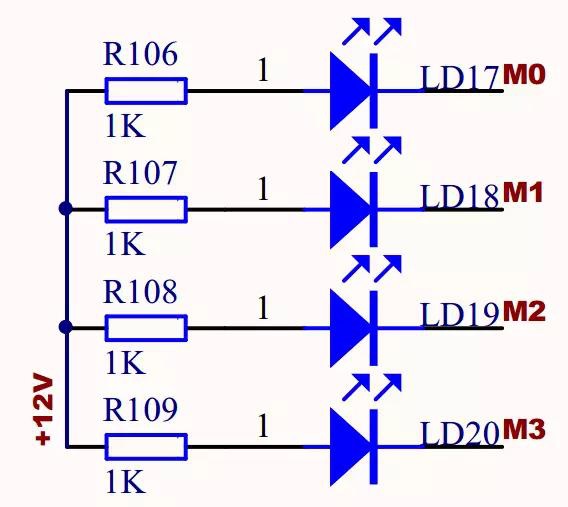 電機(jī)部分指示燈用于指示各路信號(hào)的邏輯電平狀態(tài),其中R106~109為限流電阻,防止發(fā)光二極管因電流過大燒毀。值得注意的是:該指示燈的發(fā)光二極管接成共陽極,由M0~3信號(hào)端口產(chǎn)生低電平點(diǎn)亮對(duì)應(yīng)的二極管,而ULN2003的OUT與IN邏輯電平相反,因此對(duì)于I/O口FM0~3來說,輸出高電平就能點(diǎn)亮對(duì)應(yīng)的發(fā)光二極管,例如:FM0輸出高電平,則對(duì)應(yīng)LD17點(diǎn)亮,編程時(shí)應(yīng)注意此電路將I/O實(shí)際邏輯反相了兩次,對(duì)應(yīng)關(guān)系為I/O口輸出哪路高電平則對(duì)應(yīng)點(diǎn)亮哪路指示燈。