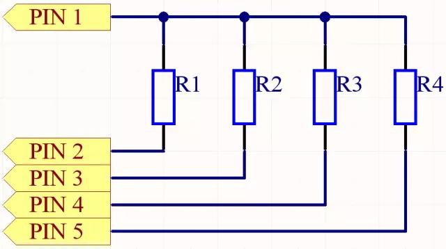 圖2-1中Header 4X2為4排2列插針,F(xiàn)M0~3為FPGA芯片I/O輸出口,加入的插針給予一個(gè)可動(dòng)的機(jī)制,在需要使用時(shí)才用跳線帽進(jìn)行相連,提高I/O口的使用效率。RES5是五端口排阻,內(nèi)部集成了4個(gè)等阻值且一端公共連接的電阻,PIN 1是公共端,PIN2~5為排阻的輸出端,排阻原理圖如圖2-2所示: