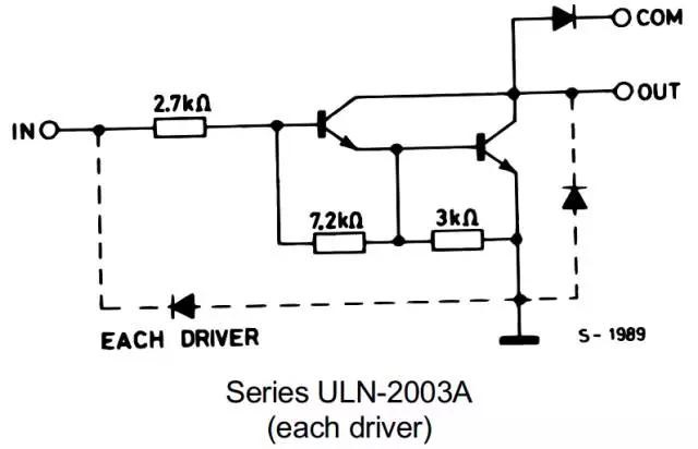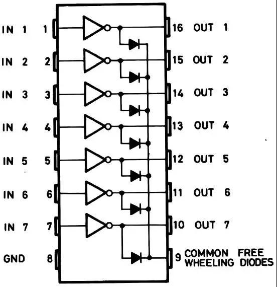 芯片ULN2003內(nèi)部集成7組達(dá)林頓管,專門用于提高驅(qū)動(dòng)電流,芯片引腳間邏輯如圖2-3所示: