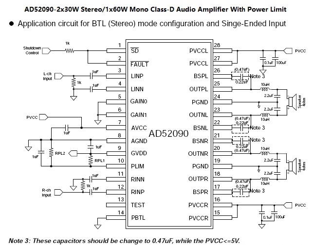 The AD52090 is a high efficiency stereo class-D audio amplifier with adjustable power limit function.