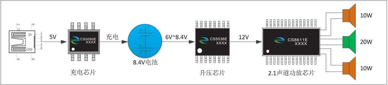 深圳市永阜康科技有限公司推出基于CS8611E單芯片移動(dòng)2.1聲道藍(lán)牙音箱解決方案。采用雙節(jié)鋰電池串聯(lián)8.4V做電源,再加一個(gè)升壓芯片CS5036E升壓到12V給CS8611E供電,實(shí)現(xiàn)20W+2×10W輸出;而充電采用CS5090E USB 5V輸入兩節(jié)鋰電池串聯(lián)8.4V充電管理芯片,非常方便。在鋰電池為電源的狀態(tài)下提供媲美傳統(tǒng)2.1音箱的聽(tīng)覺(jué)體驗(yàn)。