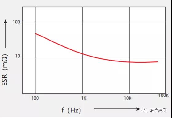 紋波電流的頻率修正系數(shù) , 將影響壽命的各頻率下的紋波電流應(yīng)力設(shè)定為同等 , 是非常具有意義的數(shù)值。紋波動電流引起的發(fā)熱產(chǎn)生影響的電阻值(等效串聯(lián)電阻 ,ESR), 如下圖所示 , 呈現(xiàn)一旦頻率升高就會下降的傾向。因此 , 頻率越高 , 紋波電流就越易于流過。