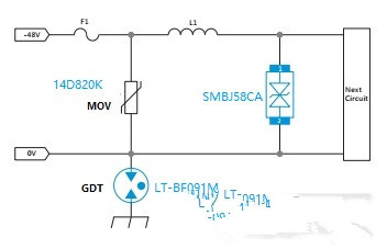 TVS不僅可以用于電源系統(tǒng)的浪涌防護,還可以用于信號線路的浪涌保護,采用氣體放電管GDT 與TVS管組合成信號浪涌保護器,其特點是反應(yīng)快,漏流小,幾乎對信號無損耗,可以對高速網(wǎng)絡(luò)線路提供安全、可靠的保護,如圖所示。
