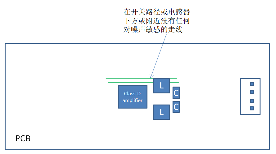 D類放大器產(chǎn)生PWM脈沖,揚(yáng)聲器端子橋接負(fù)載配置,揚(yáng)聲器驅(qū)動(dòng)器大約是電源的兩倍。 工作頻率一般為384Khz至768Khz,快速切換對(duì)具有快速上升時(shí)間(nS)和短脈沖寬度,因此這可能會(huì)出現(xiàn)嚴(yán)重的RF發(fā)射干擾,使芯片到揚(yáng)聲器之間的走線成為天線,所以 處理組件放置很重要。