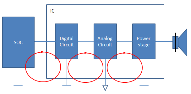 在芯片內(nèi)部,模擬和數(shù)字域需要相互通信。 下面的紅色環(huán)路是地電流。 這意味著存在從不同接地流入和流出的返回電流。 由于這些接地回路電流和每個(gè)電路之間的連接阻抗,以避免噪聲從數(shù)字電路耦合到模擬電路。 建議使用不同的接地以避免開關(guān)耦合通過地面的噪聲, 即使連接一個(gè)小電阻來增加分離也可