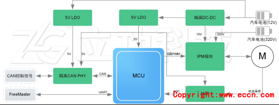 隨著汽車的逐年增長,汽車電動部分的控制也隨之而升,諸如汽車高壓輔助電機、壓縮機、油泵、水泵、渦輪增壓器、各種風(fēng)扇等。雖然傳統(tǒng)的分立式也能滿足需求,但是集成度不高,參數(shù)選型繁瑣,預(yù)驅(qū)和驅(qū)動相結(jié)合,總體設(shè)計較為復(fù)雜,ZLG 基于ON的智能功率模塊推出了適用于汽車三相650V 30A/40A/50A IPM電機控制解決方案,如圖1所示。與普通的IGBT相比,IPM在系統(tǒng)性能及可靠性方面得到進一步的提升。