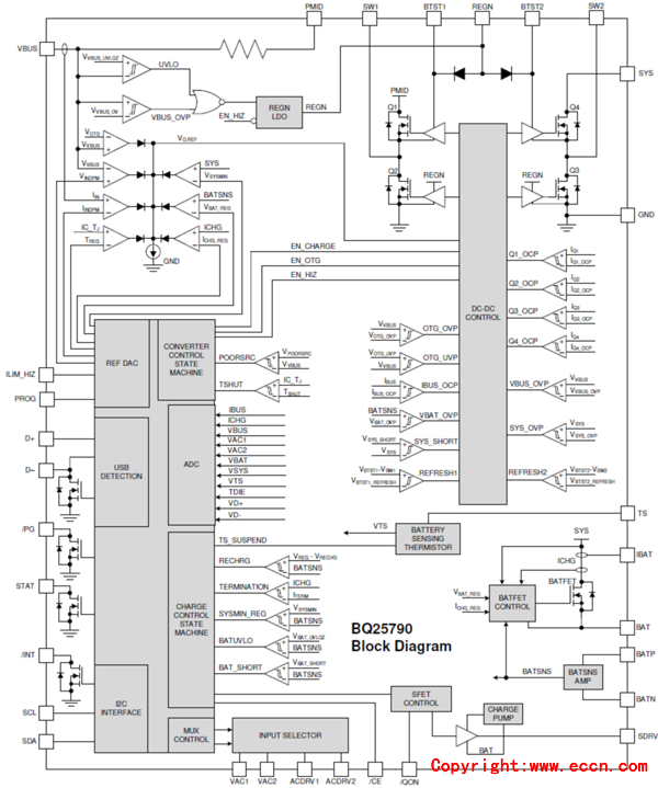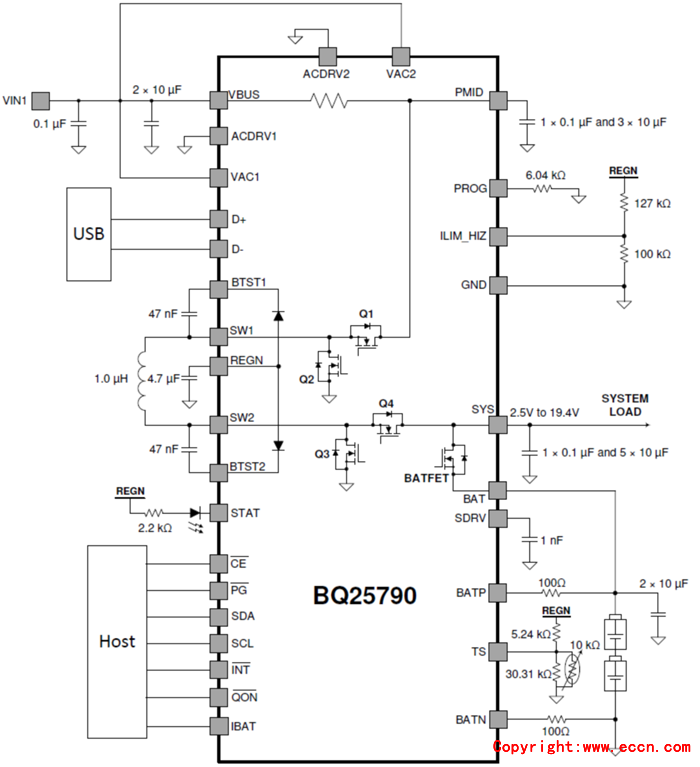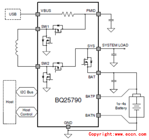 TI公司的bq25790是5A一個到四個電池開關(guān)模式全集成降壓-升壓電池充電器,用于鋰電池和鋰聚合電池, 包括有4個開關(guān)的MOSFET(Q1,Q2,Q3和Q4),輸入和充電電流檢測電路,電池FET(QBAT)和降壓-升壓轉(zhuǎn)換器所有的回路補償.器件對充電電池在USB Type-C™和USB供電(USB-PD)應(yīng)用如智能手機,平板電腦和其它手持設(shè)備的全輸入電壓范圍內(nèi)提供高功率密度和設(shè)計靈活性.該器件采用750kHz和1.5MHz可編程開關(guān)頻率,具有優(yōu)化的效率:3A ICHG時,2個電池的效率為96.5%(9V輸入),15V輸入時效率為94.5%.充電電流高達5A,分辨率為10mA,工作電壓3.6V到24V, 絕對最大額定值為30V,檢查USB BC1.2, SDP, CDP, DCP, HVDCP和非標準適配器,可檢查USB BC1.2, SDP, CDP, DCP, HVDCP和非標準適配器. 2個電池時的充電電壓調(diào)整率為±0.5%高精度,充電電流調(diào)整度為±5%,輸入電流調(diào)整度為±5%,器件具有熱調(diào)節(jié)和熱關(guān)斷特性,輸入/電池OVP和OCP,轉(zhuǎn)換器MOSFET OCP以及充電安全計時器.56引腳2.9x3.3mm WCSP封裝. 主要用在智能手機,平板電腦和無人機,無線揚聲器和數(shù)碼相機,移動打印機,電子銷售終端(EPOS).本文介紹了BQ25790主要特性,功能框圖,多種應(yīng)用框圖,以及評估模塊BQ25790EVM (bmS027)主要特性,電路圖,材料清單和PCB設(shè)計圖.