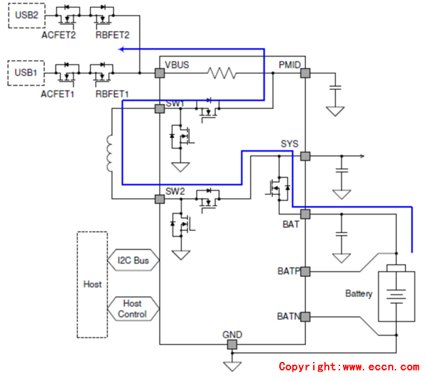圖2. bq25790 OTG模式簡化應(yīng)用框圖