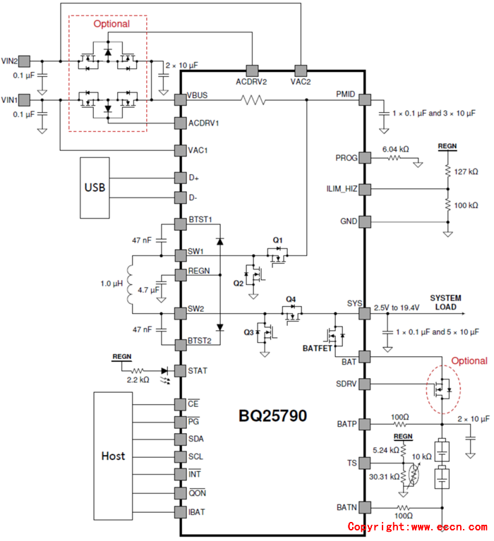 圖4. bq25790兩輸入源和可選FET應(yīng)用框圖