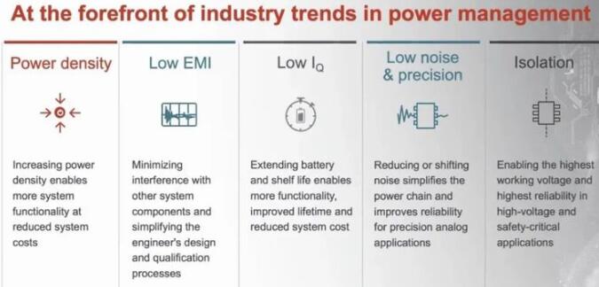 第一,高功率密度。第二,低EMI。第三,低IQ。第四,低噪度、高精度的需求。第五,隔離。