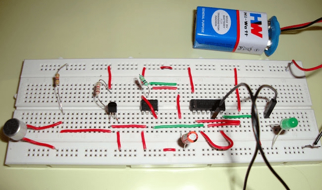 我們使用電容麥可分來感知聲音,三極管來觸發(fā)555定時器,而555定時器來設(shè)置和重置D觸發(fā)器,而D觸發(fā)器來則用于記憶下一次拍手/聲音之前的邏輯電平(LED打開或關(guān)閉)。