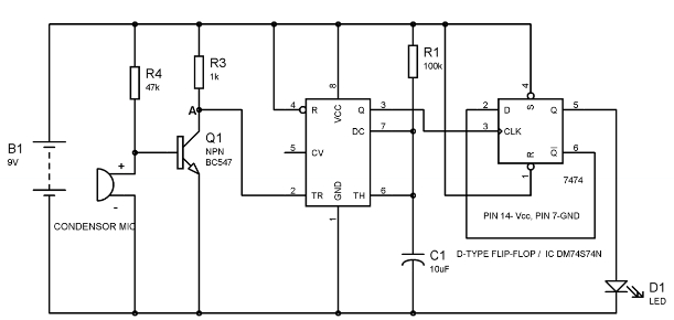 現(xiàn)在我們在電容麥克風(fēng)上產(chǎn)生一些聲音,這股聲能會轉(zhuǎn)換為電能,從而升高基極上的電平致使三極管導(dǎo)通。一旦三極管導(dǎo)通,A點電平將變低從而因為低電壓(低于Vcc/3)而觸發(fā)555定時器。所以輸出引腳3為高,一個正時鐘脈沖會是加到D觸發(fā)器上,使LED打開。觸發(fā)器的SET狀態(tài)會一直保持,直到下一次時鐘脈沖的到來。D觸發(fā)器的具體原理在下一部分中講解。