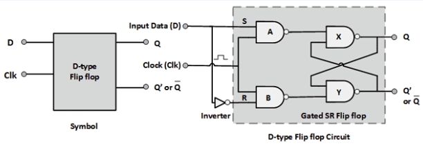 所以D觸發(fā)器基本就是S-R觸發(fā)器的改進(jìn)版。在S-R出發(fā)其中,S=0和R=0的情況是不允許的,因為這會讓觸發(fā)器的行為充滿不確定性。該問題在D觸發(fā)器中解決了,通過在兩個輸入之間加入一個逆變器(見上方原理圖)。而第二輸入則給到去NAND門的時鐘脈沖。此處的逆變器是為了避免輸入上的相同邏輯電平,這樣"S=0同時R=0"的情況就不會發(fā)生了。