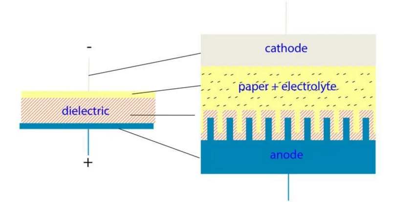 所有電容器都由兩層導(dǎo)電材料(或電極)組成,這兩層導(dǎo)電材料則由介電材料制成的一個絕緣體隔開。這些層之間會產(chǎn)生一個電場,當(dāng)有電流給電容器充電時(shí),它就可以存儲能量。鋁電解電容器的特點(diǎn)是它的電極由鋁箔制成, 而導(dǎo)電液體, 即電解液置于兩個鋁箔電極之間。通過電化學(xué)反應(yīng),在陽極上箔會形成氧化層(Al2O3),它在鋁電解電容器中充當(dāng)電介質(zhì)。