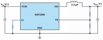 圖1.ADP2386降壓變換器,其開關頻率由電阻RT設置