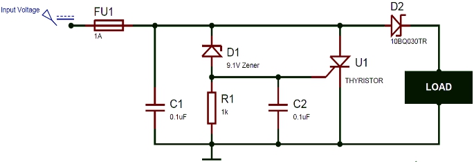而何種電壓下產(chǎn)生短路則取決于齊納電壓。電路由一個(gè)晶閘管構(gòu)成,晶閘管會(huì)直接連在輸入電壓和地之間,但晶閘管因?yàn)殚T極接地所以默認(rèn)為關(guān)斷狀態(tài)。當(dāng)輸入電壓超過齊納電壓后,齊納二極管導(dǎo)通,因此電壓加到晶閘管門極,使得輸入電壓與地之間產(chǎn)生短路。短路會(huì)從電源中產(chǎn)生龐大的電流,從而熔斷保險(xiǎn)絲,使得負(fù)載與電源斷開。