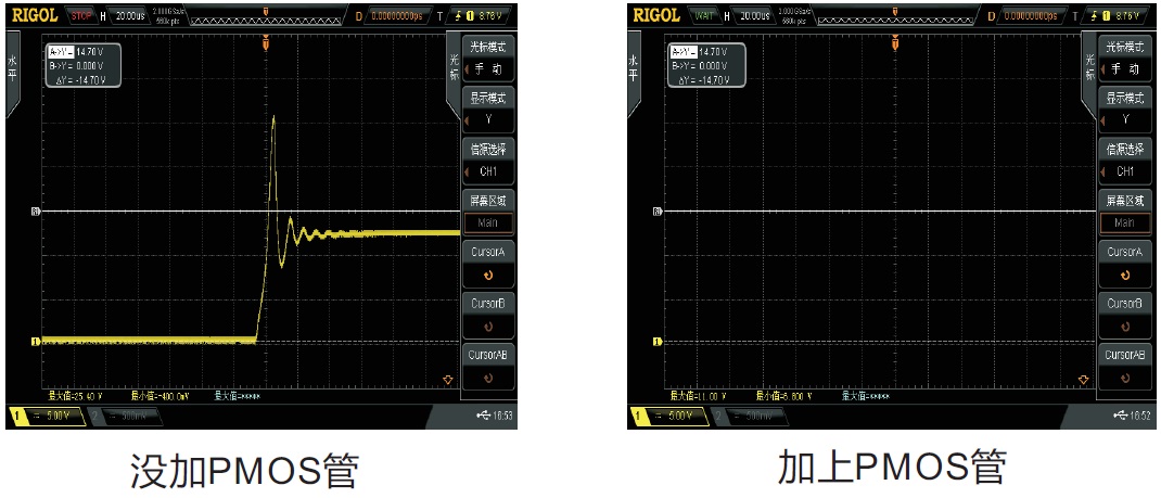 沒加PMOS管,在芯片BAT端口出現(xiàn)一個很高的尖峰電壓。