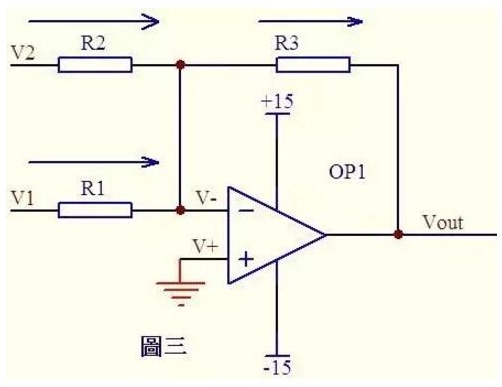 圖三中,由虛短知:V-=V+=0……a由虛斷及基爾霍夫定律知,通過(guò)R2與R1的電流之和等于通過(guò)R3的電流,故(V1–V-)/R1+(V2–V-)/R2=(Vout–V-)/R3……b代入a式,b式變?yōu)閂1/R1+V2/R2=Vout/R3如果取R1=R2=R3,則上式變?yōu)閂out=V1+V2,這就是傳說(shuō)中的加法器了。