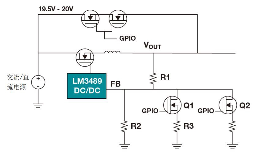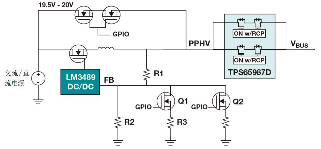 對(duì)于這個(gè)具體的設(shè)計(jì)示例,我會(huì)使用 TI 的 LM3489 磁滯 p 溝道 FET(PFET)控制器。該集成電路(IC)允許外部 PFET 上 100%的占空比,可直接從 AC/DC 轉(zhuǎn)換器通過(guò)外部 19.5 V。市場(chǎng)上大多數(shù) USB PD 控制器都具有通用輸入/輸出(GPIO),用于控制外部穩(wěn)壓器輸出電壓。PD 控制器可以通過(guò)調(diào)節(jié)降壓的反饋網(wǎng)絡(luò)來(lái)調(diào)整 LM3489 DC/DC 降壓轉(zhuǎn)換器的輸出電壓。
