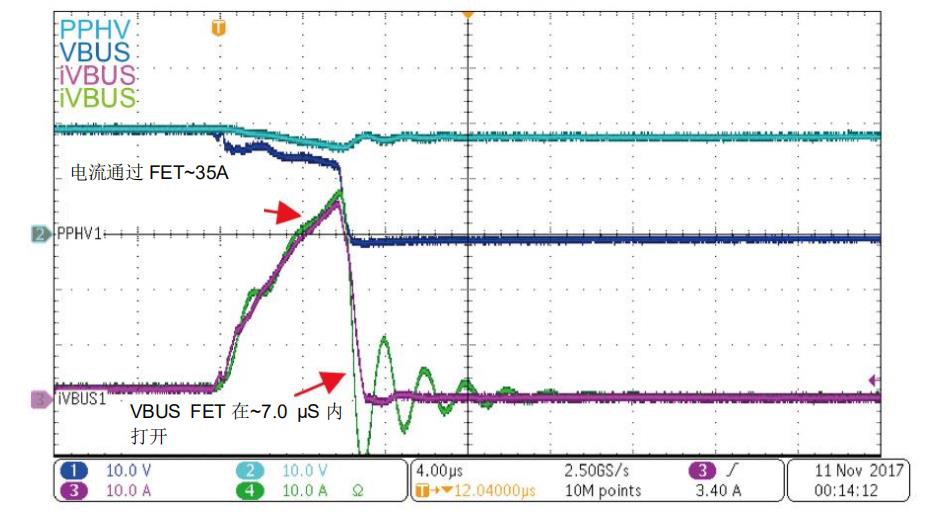 圖4重點(diǎn)說(shuō)明了在具有適當(dāng)保護(hù)的電源路徑的VBUS對(duì)地短路期間會(huì)發(fā)生的情況。當(dāng)VBUS上的電流迅速上升至約35 A時(shí),USB PD控制器檢測(cè)到此大電流并立即斷開(kāi)FET。VBUS對(duì)地短路保護(hù)必須通過(guò)硬件比較器作為固件來(lái)實(shí)現(xiàn)。固件實(shí)現(xiàn)無(wú)法足夠快速地做出反應(yīng)以保護(hù)電源路徑和系統(tǒng),這種電源路徑快速關(guān)斷可在發(fā)生硬短路時(shí)保護(hù)系統(tǒng)和FET。